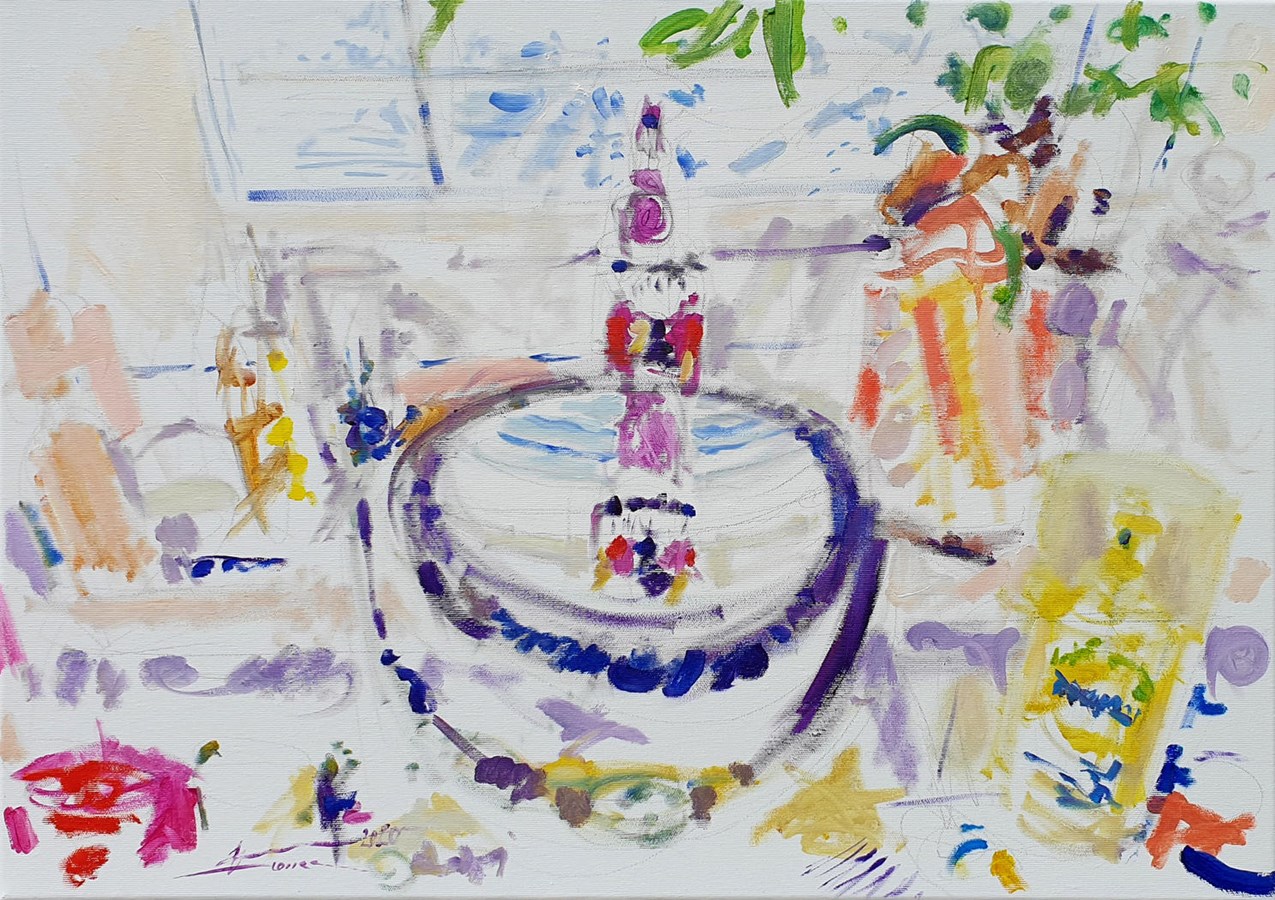 Razstavlja Alojz Konec, akademski slikar in srednješolski profesor likovne umetnosti. Na ogled je postavil svoje recentne slike zadnjih dveh let v olju in akvarelu. Osredotoča se na zaznavanje hitre, bežeče, fragmentirane, ovirane, zastrte in indirektne realnosti. Slavi življenje in energijo vividnih barv na belini, na kateri žarijo v zanosnih potezah čopiča na samem robu prepoznave.
