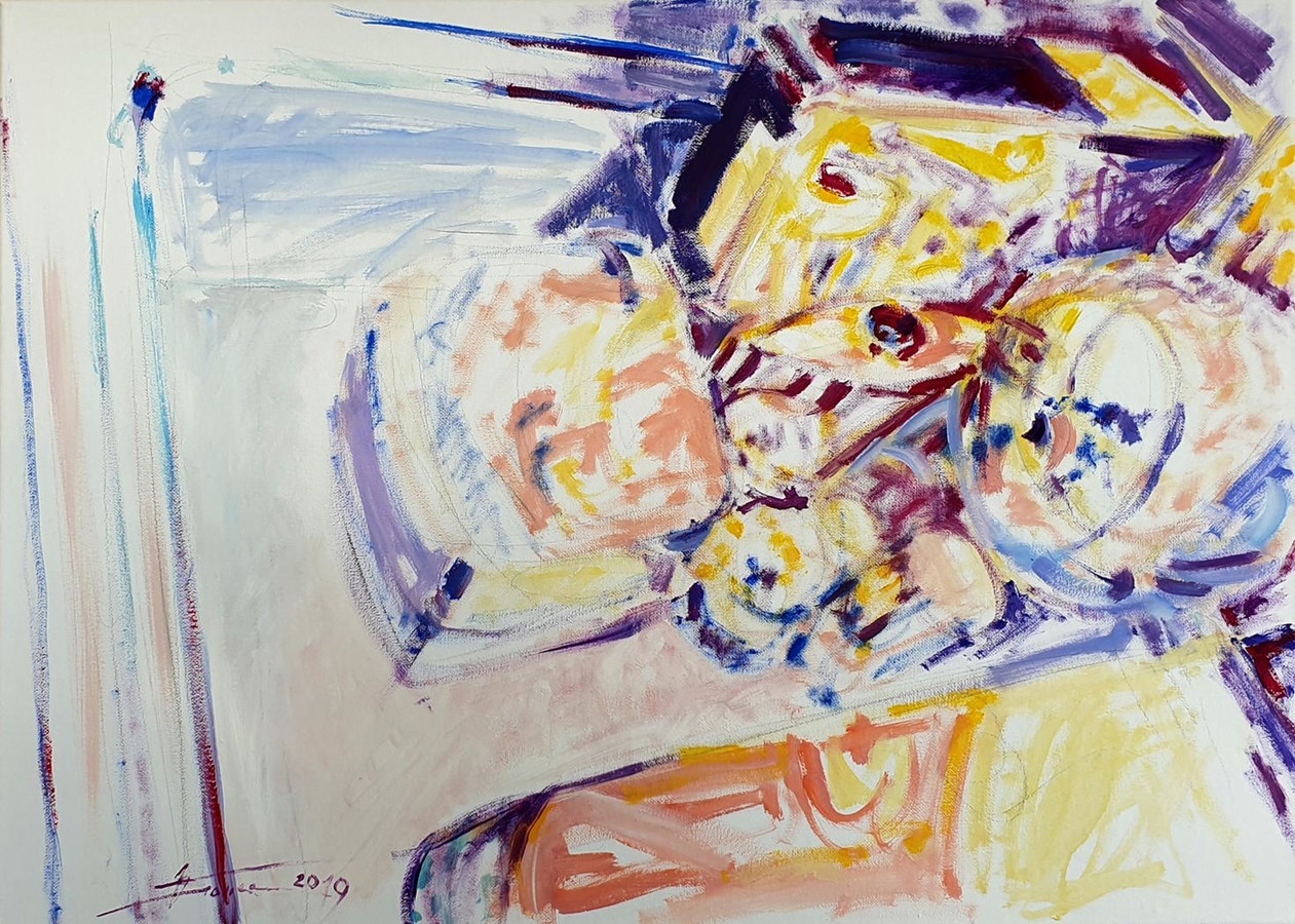 Glavno besedo mojih slik imajo barve. Tvorijo armaturo slikinega polja. So njen genski zapis, gostobeseden in zgovoren. Gradijo njeno harmonijo in nosijo njeno energijo. Življenje in energija vividnih barv na belini. Kaligrafski ples njihoviz potez. Narejenih v zanosu med impresijo in ekspresijo. Položenih na kozmično vse vsebujočo belino. Kot prapok rojenih iz krčev trebušnih mišic. Morfogeneza.